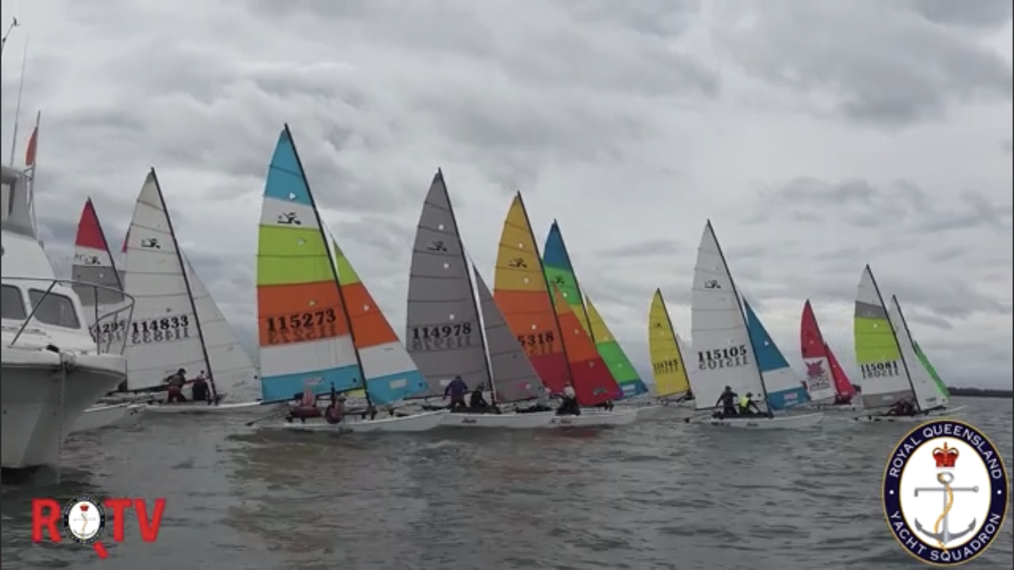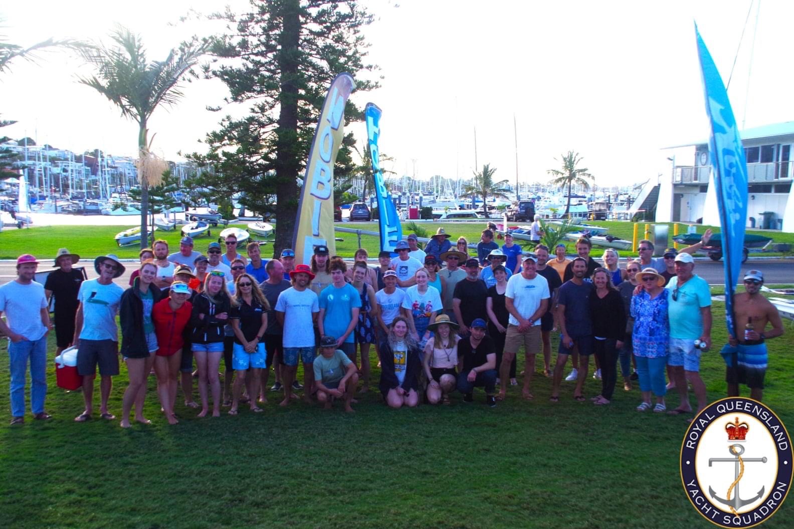 After a leisurely morning rigging up on the soggy lawns of RQYS, and much of the Family socialising for the first time since Lake Cootharaba, briefing was held in the sunshine, where an overly excited QLD Assoc. President gave the Family a very warm welcome.