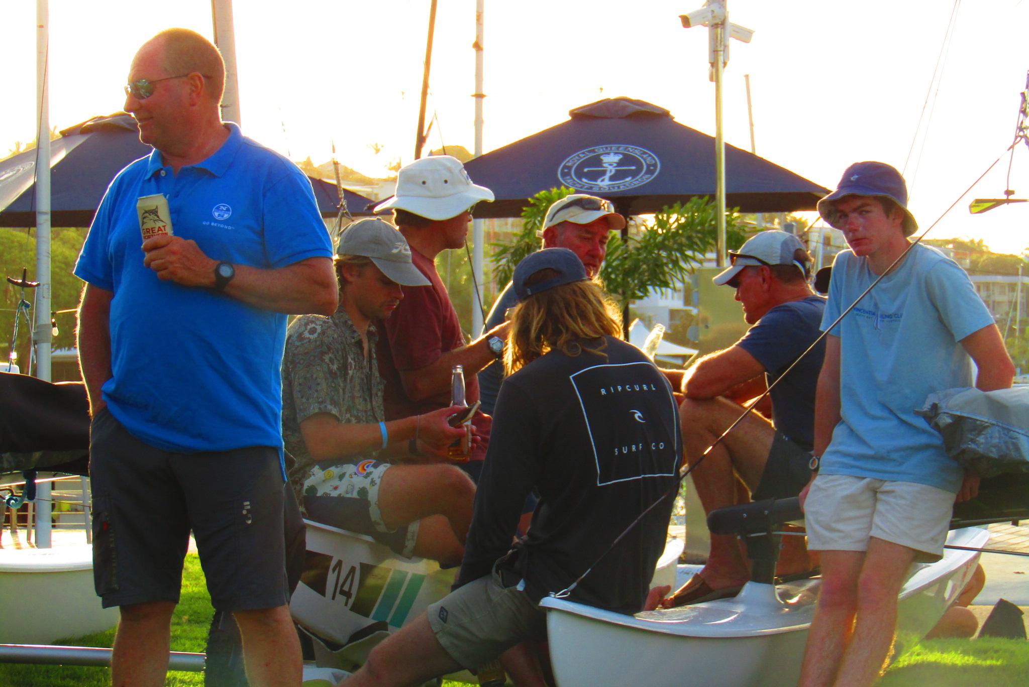 Whilst sailors stripped down out of their gear to reduce the likelihood of over-exhaustion, and the rafting up of cats began to ensue, the one and only Rob Andrews sat in the middle of the fleet, on the bow ‘Jaygo‘, sinking back stubbies whilst the rest of us looked on earnestly.