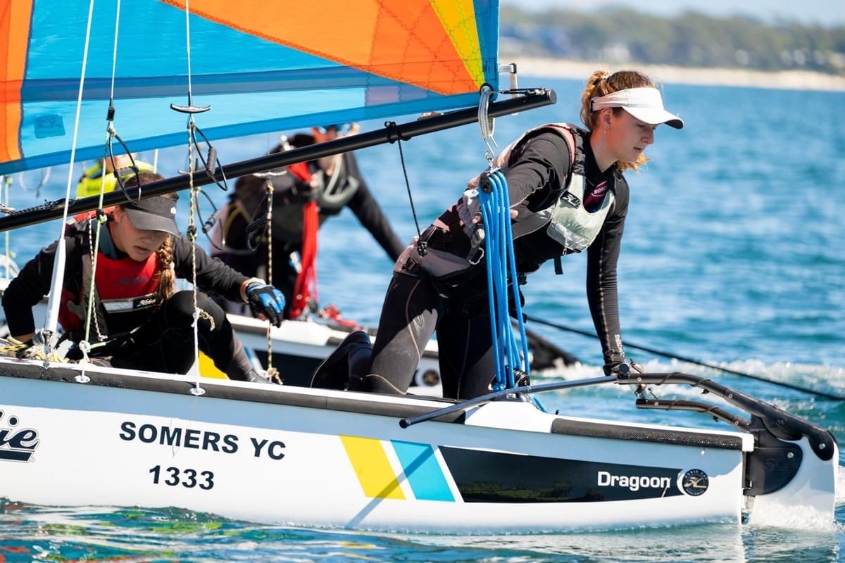 The boys from the VSC, Henry and Joaquin, who have only been sailing for four months, showed phenomenal improvement over the course of the regatta. Where on the last race, were leading all the way until the final downwind, where fellow VSC up and coming superstar, James, with Victorians Jack and Abi on board over the course of the regatta, took the lead with a bullet in the final race. Young Nikki, and seasoned crew, her old-man John, sailed magnificently over the week, rounding it up with the bronze. James, with Abi and Jack, took the silver after a consistent improvement on the race course. And without further ado, we congratulate and applaud the performance of our Australian National Hobie Dragoon Champions, the girls from Somers, Matilda and Emily!